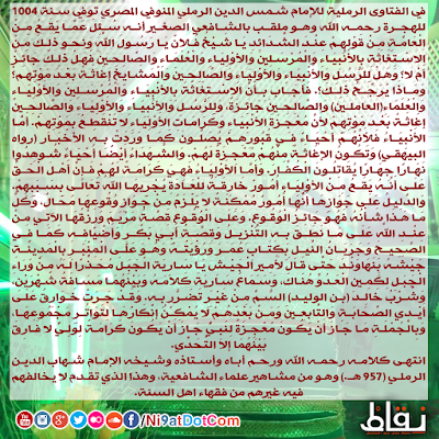 في الفتاوى الرملية للإمام شمس الدين الرملي المنوفي المصري توفي سنة 1004 للهجرة رحمه الله وهو ملقب بالشافعي الصغير أنه سُئِلَ عَمَّا يَقَعُ مِنْ الْعَامَّةِ مِنْ قَوْلِهِمْ عِنْدَ الشَّدَائِدِ يَا شَيْخُ فُلانٌ يَا رَسُولَ اللَّهِ ونحو ذَلِكَ مِنْ الاسْتِغَاثَةِ بِالأَنْبِيَاءِ وَالْمُرْسَلِينَ وَالأوْلِيَاءِ وَالْعُلَمَاءِ وَالصَّالِحِينَ فَهَلْ ذَلِكَ جَائِزٌ أَمْ لا؟ وَهَلْ لِلرُّسُلِ وَالأَنْبِيَاءِ وَالأَوْلِيَاءِ وَالصَّالِحِينَ وَالْمَشَايِخِ إغَاثَةٌ بَعْدَ مَوْتِهِم؟ْ وَمَاذَا يُرَجِّحُ ذَلِكَ؟. فَأَجَاب بِأَنَّ الاسْتِغَاثَةَ بِالأنْبِيَاءِ وَالْمُرْسَلِينَ وَالأَوْلِيَاءِ وَالْعُلَمَاءِ(العاملين) وَالصَّالِحِينَ جَائِزَةٌ، وَلِلرُّسُلِ وَالأنْبِيَاءِ وَالأَوْلِيَاءِ وَالصَّالِحِينَ إغَاثَةٌ بَعْدَ مَوْتِهِمْ لأَنَّ مُعْجِزَةَ الأنْبِيَاءِ وَكَرَامَاتِ الأَوْلِيَاءِ لا تَنْقَطِعُ بِمَوْتِهِمْ. أَمَّا الأَنْبِيَاءُ فَلأَنَّهُمْ أَحْيَاءٌ فِي قُبُورِهِمْ يُصَلُّونَ كَمَا وَرَدَتْ بِهِ الأخْبَار (رواه البيهقي) وَتَكُونُ الإغَاثَةُ مِنْهُمْ مُعْجِزَةً لَهُمْ. وَالشُّهَدَاءُ أَيْضًا أَحْيَاءٌ شُوهِدُوا نَهَارًا جِهَارًا يُقَاتِلُونَ الْكُفَّارَ. وَأَمَّا الأَوْلِيَاءُ فَهِيَ كَرَامَةٌ لَهُمْ فَإِنَّ أَهْلَ الْحَقِّ عَلَى أَنَّهُ يَقَعُ مِنْ الأوْلِيَاءِ أُمُورٌ خَارِقَةٌ لِلْعَادَةِ يُجْرِيهَا اللَّهُ تَعَالَى بِسَبَبِهِمْ. وَالدَّلِيلُ عَلَى جَوَازِهَا أَنَّهَا أُمُورٌ مُمْكِنَةٌ لا يَلْزَمُ مِنْ جَوَازِ وُقُوعِهَا مُحَالٌ، وَكُلُّ مَا هَذَا شَأْنُهُ فَهُوَ جَائِزُ الْوُقُوعِ. وَعَلَى الْوُقُوعِ قِصَّةُ مَرْيَمَ وَرِزْقُهَا الآتِي مِنْ عِنْدِ اللَّهِ عَلَى مَا نَطَقَ بِهِ التَّنْزِيلُ وَقِصَّةُ أَبِي بَكْرٍ وَأَضْيَافِهِ كَمَا فِي الصَّحِيحِ وَجَرَيَانُ النِّيلِ بِكِتَابِ عُمَرَ وَرُؤْيَتُهُ وَهُوَ عَلَى الْمِنْبَرِ بِالْمَدِينَةِ جَيْشَهُ بِنَهَاوَنْدَ حَتَّى قَالَ لأَمِيرِ الْجَيْشِ يَا سَارِيَة الْجَبَلَ مُحَذِّرًا لَهُ مِنْ وَرَاءِ الْجَبَلِ لِكَمِينِ الْعَدُوِّ هُنَاكَ، وَسَمَاعُ سَارِيَةَ كَلامَهُ وَبَيْنَهُمَا مَسَافَةُ شَهْرَيْنِ، وَشُرْبُ خَالِد (بن الوليد) السُّمَّ مِنْ غَيْرِ تَضَرُّرٍ بِهِ. وَقَدْ جَرَتْ خَوَارِقُ عَلَى أَيْدِي الصَّحَابَةِ وَالتَّابِعِينَ وَمَنْ بَعْدَهُمْ َلا يُمْكِنُ إنْكَارُهَا لِتَوَاتُرِ مَجْمُوعِهَا، وَبِالْجُمْلَةِ مَا جَازَ أَنْ يَكُونَ مُعْجِزَةً لِنَبِيٍّ جَازَ أَنْ يَكُونَ كَرَامَةً لِوَلِيٍّ لا فَارِقَ بَيْنَهُمَا إلا التَّحَدِّي.