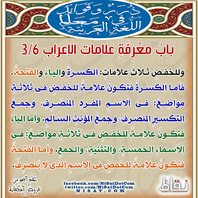 (وللخفض ثلاث علامات : الكسرة والياء والفتحة)