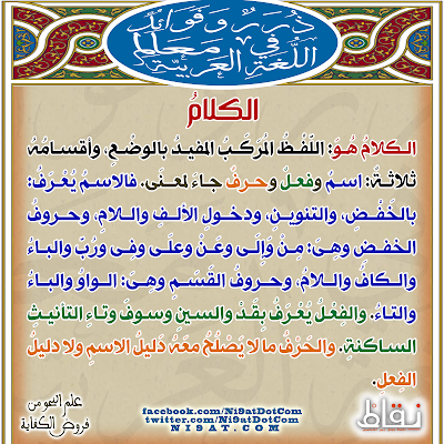 (الكلامُ هو اللَّفْظُ المُرَكّبُ المفيدُ بالوضعِ ) يعني أن الكلام عند النحويين هو اللفظ إلى ءاخره، فاللفظ هو الصوت المشتمل على بعض الحروف الهجائية كزيد، فإنه صوت اشتمل على الزاي والياء والدال، فإن لم يشتمل على بعض الحروف كصوت الطبل فلا يسمى لفظاً، فخرج باللفظ ما كان مفيدا ولم يكن لفظا كالإشارة والكتابة والعَقْد والنُّصُب فلا تسمى كلاما عند النحاة. والمركب ما تركب من كلمتين فأكثر،كقام زيد وزيد قائم، والمثال الأول فعل وفاعل وكل فاعل مرفوع، والمثال الثاني مبتدأ وخبر وكل مبتدإ مرفوع بالإبتداء وكل خبر مرفوع بالمبتدإ، وخرج بالمركب المفرد كزيد فلا يقال له كلام أيضا عند النحاة .